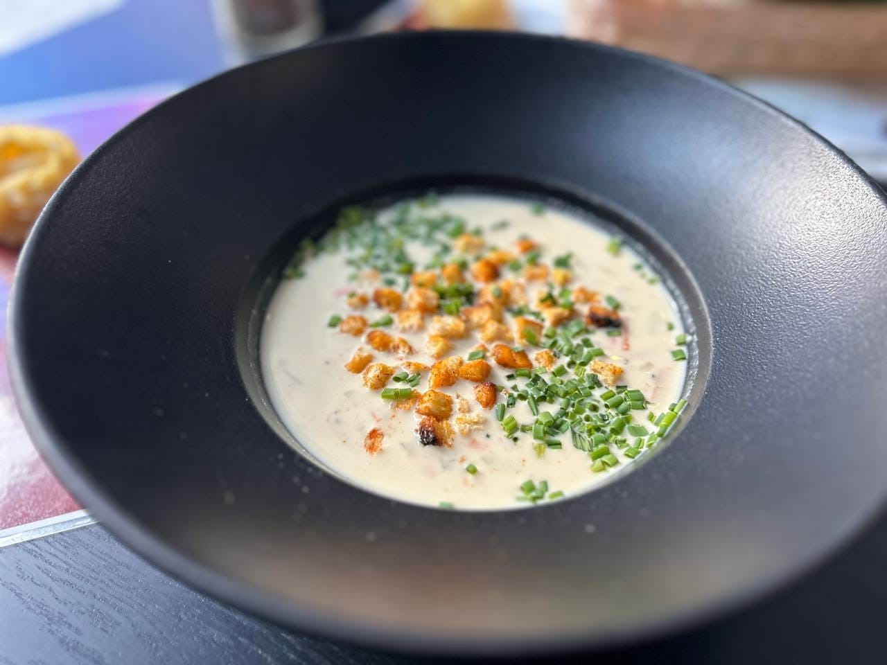 Boczek, cebula, pieczarki, sos śmietanowo-parmezanowy, pietruszka